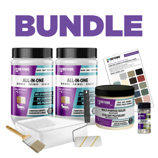 Included are two quarts of Beyond Paint in your desired color(s), ensuring a custom look that complements your space perfectly, a 2-inch natural soft bristle brush that allows for precise detailing, a ⅜-inch microfiber roller with handle that ensures smooth and even coverage on larger surfaces, a paint tray, and Beyond Paint Countertop Flecks in your desired color, multi-colored chips designed to add dimension and interest to your refinished countertop.