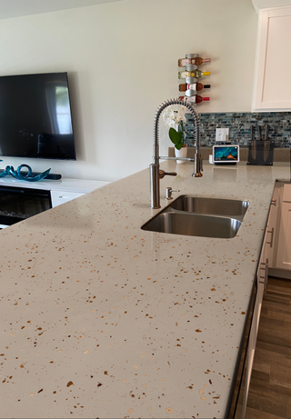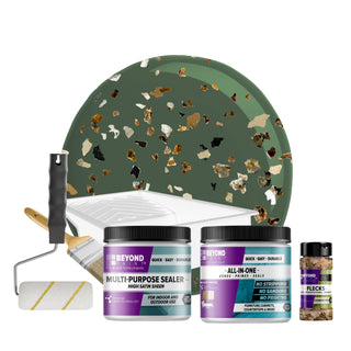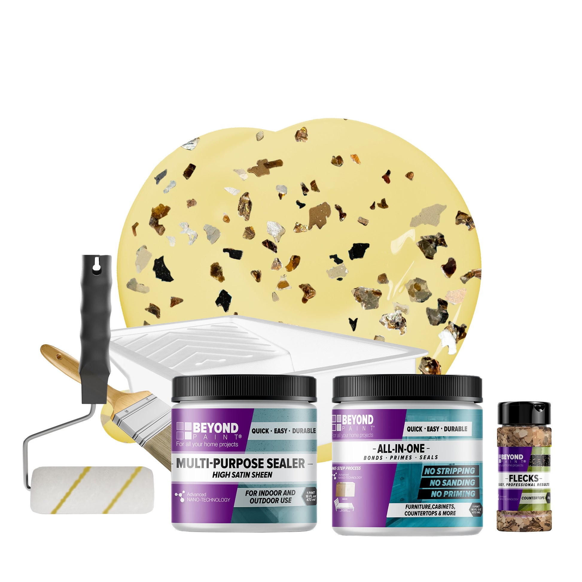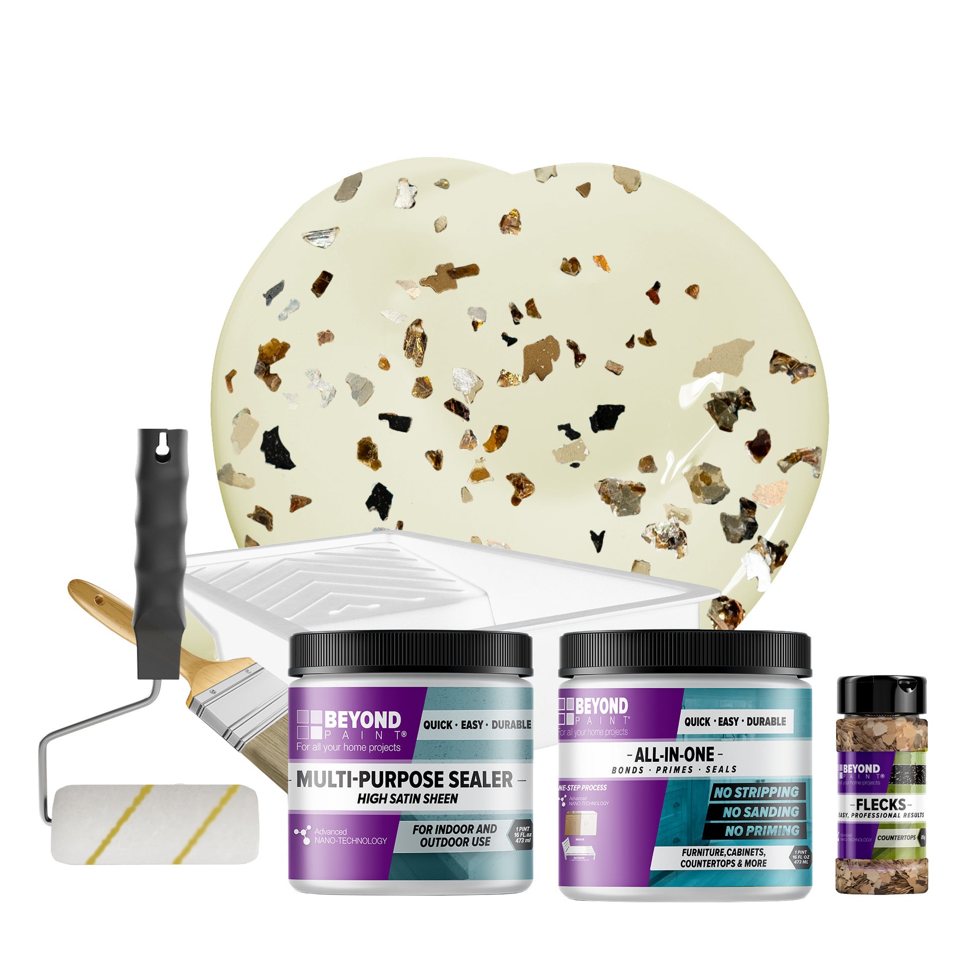Transform your countertops with ease using our All-in-One Countertop Refinishing Kit! Designed for convenience and flawless results, this comprehensive kit has everything you need to refresh your space. Included are two pints of Beyond Paint in your desired color, ensuring a custom look that complements your space perfectly, a 2-inch natural soft bristle brush allows for precise detailing, a ⅜-inch microfiber roller with handle ensures smooth and even coverage on larger surfaces, a paint tray, and Beyond Paint Oxford Bronze Metallic Countertop Flecks, multi-colored chips designed to add dimension and interest to your refinished countertop. No need to purchase extra tools or products, our Countertop Refinishing Kit makes it simple, affordable, and fun to transform your home.